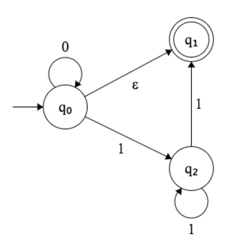 - If a $0$ is entered, does the system move to both $q_0$ and $q_1$ (the accept state)?