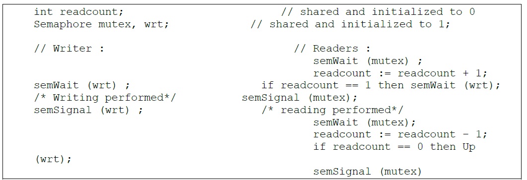 semWait(mutex); readcount := readcount - 1; if readcount == 0 then up semSignal(mutex);