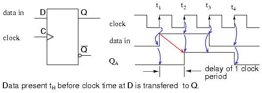 Say, in the 2nd clock cycle, Captain Marvel sends a pulse on the data-in line and — oblivious to the clock period — expects to read it off immediately (mid-phase). With his lightning speed, there’s no way he can make sense of the output of this circuit because the clock cycle is geological time to him. Billy Watson, on the other hand, can read it just fine. Neither Captain M. nor Billy W. is synchronized with the system clock. Not in the sense that the gate circuitry is. But for Billy’s experience of time, the clock’s time scale is sufficiently precise.