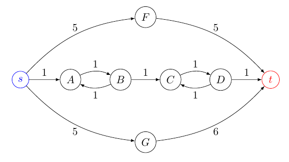 The Figure shows a digraph whose optimal solution (from the source vertex $s$ to the goal vertex $t$) is the path $pi_1 : langle s, A, B, C, D, trangle$ with a cost equal to 5. If paths are not required to be simple, then the second and third optimal paths are $pi_2 : langle s, A, B, C, D, C, D, trangle$ and $pi_3 : langle s, A, B, A, B, C, D, trangle$ both with a cost equal to 7. However, if paths are required to be simple, then the second and third optimal paths would be $pi_2 : langle s, F, trangle$ and $pi_3 : langle s, G, trangle $ with costs 10 and 11, respectively. Given a graph $G(V, E)$ where $V$ is the set of vertices and $langle u, vranglein E, u, vin V$ if there is an edge between vertices $u$ and $v$, the current state of the art for this problem to the best of my knowledge is described below: The first significant improvement to solve the $k$ optimal paths problem is Eppstein’s algorithm (Eppstein, 1998) which runs in $O(|E|+|V|log |V|+k)$. However, this algorithm requires the graph to be given explicitly. $K^*$ alleviates this requirement while maintaining the low complexity (Aljazzar & Leue, 2011) and, additionally, enables the application of admissible heuristics. In both cases, the output computed by these algorithms are not necessarily simple paths. In case that paths are required to be simple, the best results is due to Yen (Yen, 1971, 1972), generalized later by Lawler (Lawler, 1972), which using modern data structures can be implemented in $O(k|V|(|E|+|V|log |V|))$ worst-case time. In the case of undirected graphs, Katoh, Ibaraki and Mine (Katoh, Ibaraki & Mine, 1982) improve Yen’s algorithm to $O(k(|E|+|V|log |V|))$ time. While Yen’s asymptotic worst-case bound for enumerating $k$ simple shortest paths in a directed graph remains unbeaten (again, to the best of my knowledge!), several attempts have been done to outperform it in practice. One of such works is due to John Hershberger et al., who introduced a replacement paths algorithm which is known to fail scarcely. As a result, their algorithm delivers a speedup that grows linearly with the average number of edges in the $k$ shortest paths but, for some cases (as random graphs), this speedup is minimized. Hope this helps, Bibliography Aljazzar, H. & Leue, S. (2011). $K^*$: A heuristic search algorithm for finding the $k$ shortest paths. Artificial Intelligence, 175(18), 2129-2154. Eppstein, D. (1998). Finding the $k$ shortest paths. SIAM Journal on Computing, 28(2), 652-673. Hershberger, J., Maxel, M. & Suri, S. (2007). Finding the $k$ shortest simple paths: A new algorithm and its implementation. ACM Transactions on Algorithms, 3(4), 45-46 Katoh, N., Ibaraki, T. & Mine, H. (1982). An efficient algorithm for $k$ shortest simple paths. Networks, 12, 411-427. Lawler, E. L. (1972). A procedure for computing the $k$ best solutions to discrete optimization problems and its application to the shortest path problem. Management Science, 18, 401-405. Yen, J.Y. (1971). Finding the $k$ shortest loopless paths in a network. Management Sciences, 17, 712-716. Yen, J.Y. (1972). Another algorithm for finding the $k$ shortest loopless network paths. Proceedings of 41st Management Operations Research Society of America, 20. Best Answer from StackOverflow